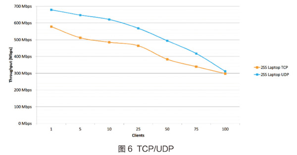 如图6所示,通过对比并发终端数量变化前后系统的TCP和UDP性能,可以发现UDP同样存在近似的性能下滑,因此可以排除TCP窗口机制导致性能下降的潜在可能。