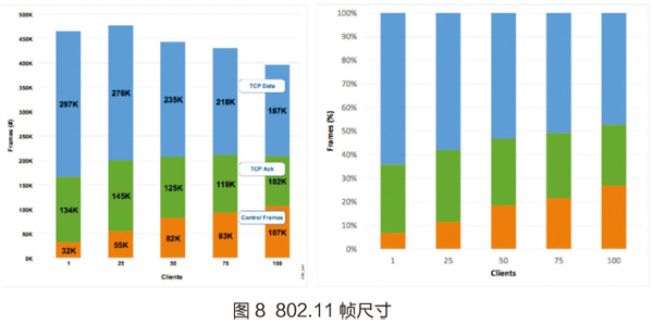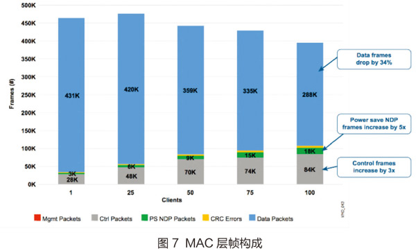 如图7所示,随着并发终端数量从1增加到100,网络中的数据帧数量减少了34%,而与此同时,控制帧数量则增加了3倍,用于唤醒Wi-Fi终端的Power Save NDP帧则更是增加了5倍。