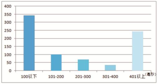 对于成功访问的829个网址,通过图1查看各个延时时间段内网址的个数(横坐标表示各个访问延时的区间,纵坐标表示落在各个区间的网址个数),可以看出,部分网址访问情况理想,部分网址访问延时较大。延迟较大的需要重点分析并予以优化。