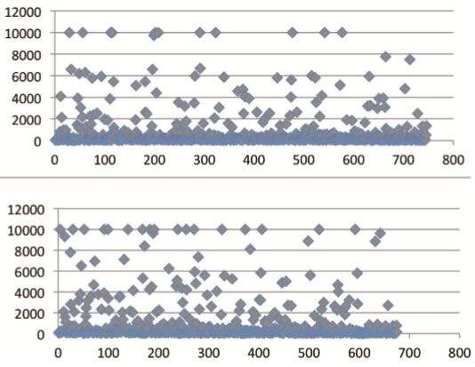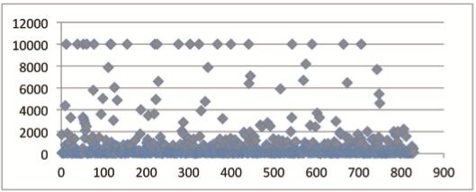 通过图2可以清晰地比较各个访问延时的总体情况(横坐标对应可成功访问的829个网址,按照访问频度排名高低从左到右排列,纵坐标表示各个网址对应的访问延时,单位毫秒)。为了便于观察,对于访问延迟大于一万毫秒的统一按照一万毫秒来标记。