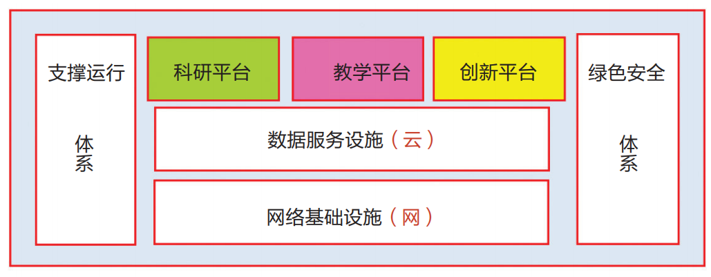 在最底层是以“TCP/IP”为基础的网络基础设施,其上是以云服务为代表的数据服务设施,它们通过技术的整合和演进为上层平台提供越来越强的通讯能力、计算能力和存储能力。在支撑运行体系和绿色安全体系的赋能之下,全面支持科研平台、教学平台和创新平台这三大应用平台的建设和发展。
