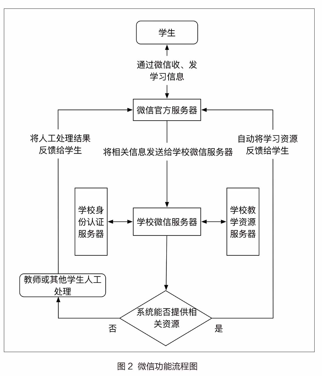 微信校园卡是微信官方推出的具备实体校园卡类似的身份识别、消费功能,同时还能灵活配置,是永不丢失的电子版校园卡。在功能上,微信校园卡可以完全替代实体校园卡,比如消费刷卡、身份认证等,相比于实体卡易消磁折损,用虚拟的微信校园卡完全可以避免这些问题,而且它和手机融为一体,具备实体卡没有的一些优点。同时利用其微信企业号的推送优势,为每一位在校师生提供方便领取微信校园卡的接口。微信功能流程图如图2所示。