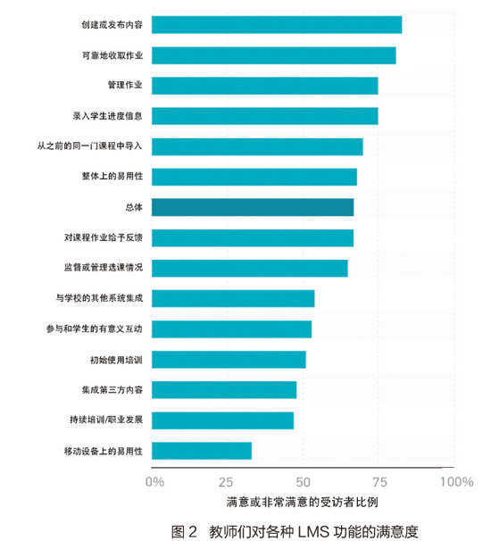 尽管LMS市场在持续变化,但是无论学校采用了哪种LMS,教师对LMS及其功能的满意度并未随着时间而发生什么变化。具体而言,在2014年、2015年和2017年的教师研究中,对LMS的满意度非常接近:2014年60%的教师对使用LMS的体验感到满意或非常满意,2015年达到59%,在本次研究中达到67%。教师不仅对LMS整体的满意度长期保持相当一致的水平,对LMS的具体功能的满意度也是如此。实际上,图2中的项目顺序,对每个LMS功能满意的教师百分比和2015年教师研究报告中的类似图表中的几乎是一致的。