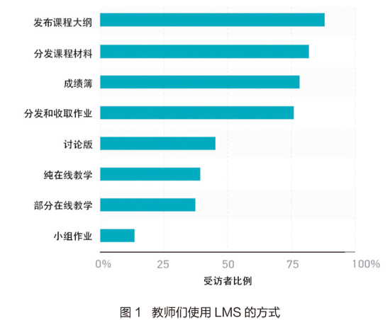 教学管理系统(Learning Management System,LMS)在高等教育界普遍存在,已经达到了市场饱和程度,几乎每所学校都至少有一套。因此,人们可能认为LMS市场已经相当成熟,但情况并非完全如此。无论学校使用的LMS是什么,教师们对LMS的用法在不同学校和不同时间中都出奇地一致。在2014年、2015年,和如图1所示的2017年的教师调查中,发布信息一致都是LMS的最常用功能。2017年的研究中,这一类别首次被分解为教师要发布的信息类型:教学大纲、讲义和作业。这三种都是LMS最常见的用途,四分之三或更多的教师为了这些目的而使用LMS。在LMS最常用的一组使用方式中还有一项发布作业功能的同伴——成绩簿。