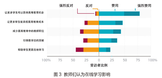 总的来说,教师看起来对在线学习的态度并不积极。教师们对关于在线学习的一组陈述的同意程度进行了评分。如图3所示,79%的教师同意或强烈同意说在线学习可以让更多的学生接受高等教育。但是只有不到50%的教师同意或强烈同意其他任何陈述,几乎一半的教师反对或强烈反对说在线学习能帮助学生更有效地学习。换句话说,几乎一半的教师认为在线学习对学生学习没有影响或者是有负面影响。