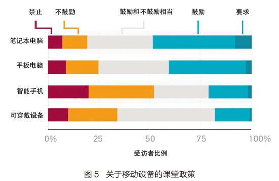 正如前文“技术融入教学”一节中的讨论,大约有一半的教师同意或强烈同意,如果能更好地将学生的笔记本电脑、平板电脑和智能手机整合到他们的课程中,他们会更有效率。但是,很大一部分教师要么不鼓励,要么干脆禁止这些设备进入教室。