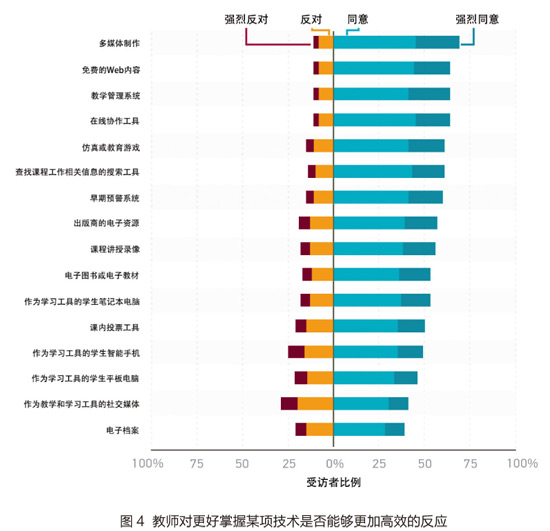 调查向受访者们展示了一份教学技术清单,并请他们对“如果我有更好的技能将这项技术融入课程,就会是个更有效率的教师”这样一个论述的同意程度进行评分。这些技术涵盖范围非常广泛,从几乎无处不在的智能手机和教学管理系统(LMS),到如教育游戏这样更多地算是小众领域的技术;从出版商制作的资源等商业产品到开放教育资源(OER)和可汗学院(KhanAcademy)这样的免费资源。