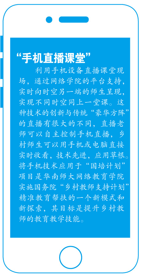 “手机教师网”于2015年经过一个暑期的研发,2016年正式运行。据报道,现在,“手机教师网”已有1000多个教师培训专题及直播课堂,5万多名教师、教研员和家长通过“手机教师网”参与活动。“手机教师网”是华南师范大学网络教育学院自主研发的手机直播技术,采用新的移动开发技术以及强大的后台支持服务,草根化、实用化的应用前端,实现“1手机+1网络”(4G或WiFi)即可进行手机直播,技术先进,应用草根。它可以通过手机、Pad等移动设备直播现场视频,在任意终端设备实时收看视频,并进行实时交流互动。