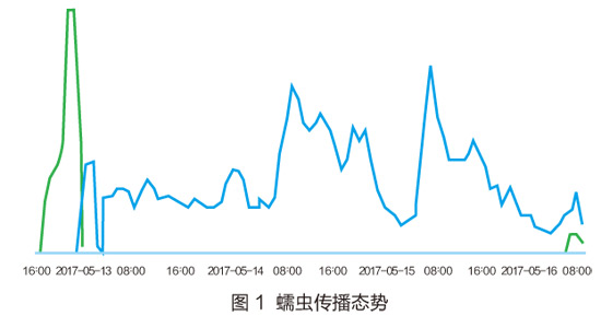此次蠕虫病毒由于英国的安全人员注册了域名,将危害控制住了。据多家专业安全公司的分析,WannaCry蠕虫感染后首先连接URL(域名为www.iuqerfsodp9ifjaposdfjhgosurijfaewrwergwea.com)。在5月12日该域名被安全分析人员注册并启用,从该域名的服务器上可以看到世界各地感染主机的DNS查询。根据来自中国的DNS查询的IP地址及其BGP AS号码,通过对域名解析量的分析,可以知道有多少人中招。图1是中国区域蠕虫传播的监测数据。绿色的线,表示在没有域名解析之前传播的量;蓝色的线,表示开始域名解析后,病毒感染的量。可以看到,域名解析后,感染数量急速下降,得到了控制。