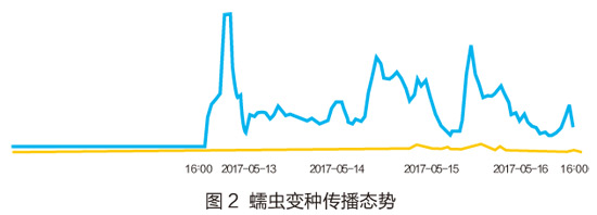 图2为变种的传播情况,变种危害性很小。图2中黄色的线代表变种,蓝色的线是原始版本的感染情况。