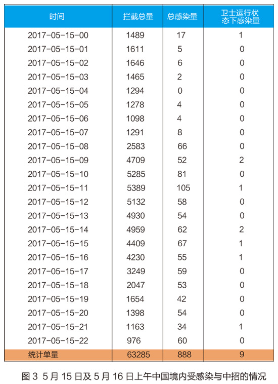 从360安全卫士监测到的感染量数据可以看到,5月15日,为受攻击的高峰,全天总拦截量为63285台,中招感染的机器为888台,其中一天中最高峰集中在10点至12点,11点时共受到了5389次攻击,共有105台电脑中招。5月16日总拦截量为15432台,中招感染的机器为302台。