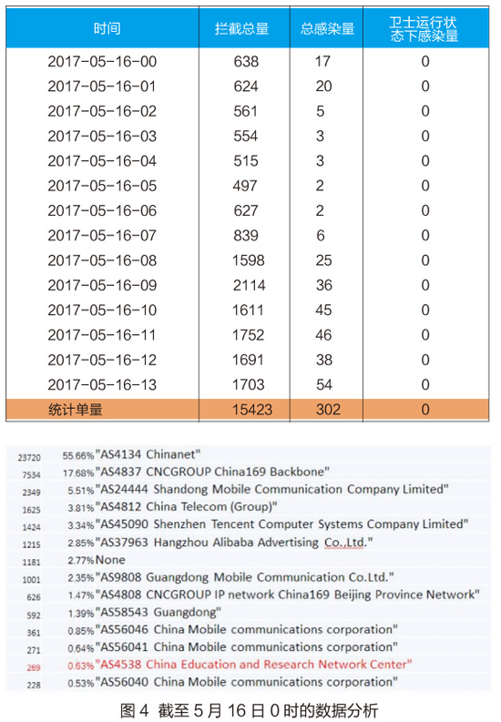 谭晓生分析了其中的原因,第一,多数校园网同时连接教育网CERNET和运营商网络;第二,校园网最早向外报告感染案例,因为用户群体在社交媒体上比较活跃;第三,高校90%的感染是通过接入运营商的网络所感染。的确,根据CERNET的调查数据,CERNET在全国调查了超过1600个高校,确认感染的单位66个,确认感染的电脑数百台。