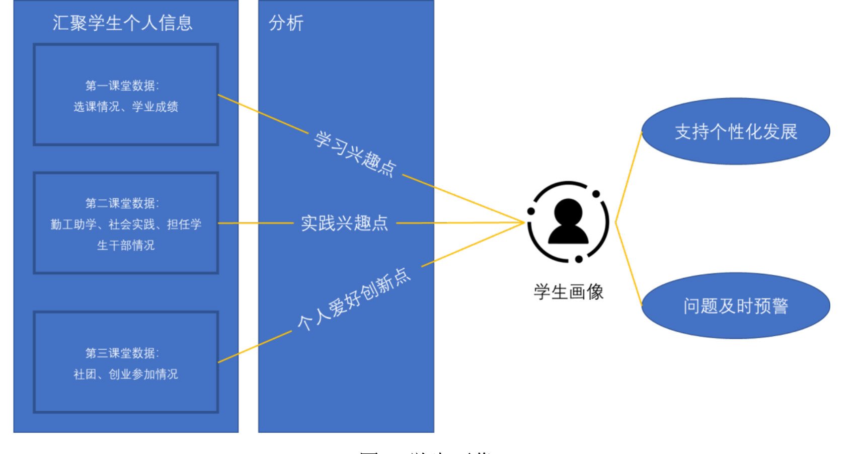 以学生画像为例,如图2所示,可以将来自教务系统的“第一课堂”信息,与来自学工系统、双创学院系统的“第二课堂”、“第三课堂”信息汇集成一个完成的学生画像,再与每个学生的个性化培养方案相比照,在学生需要帮助的时候适时给出“支架”帮助,从而实现真正的个性化的培养。