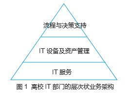 目前,高校信息化管理部门同时肩负管理(主要是IT设备和应用系统管理)和IT服务两种职能,按照网络、应用系统开发、数据整合、多媒体教室设备管理、实验室管理、网络安全管理、一卡通系统管理、有线电视网络管理等“块状”业务设计组织架构。但是,随着用户需求的变更和技术的发展,这种“块状”的业务划分方法将面临变革,转变为图1所示的层次状架构。