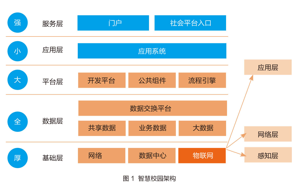 根据物联网的校园应用场景的实践,我们大致把智慧校园分为四个层次:第一层是数字校园,主要是实现设备信息化,校园中物物相连是基础和关键;第二层是智能校园,实现管理信息化;第三层是智慧校园,实现服务信息化;第四层是学习校园,实现学习信息化,学习校园是学校对智慧校园建设的基本要求也是智慧校园建设的终极目标。智慧校园架构如图1所示,在这个构架中,我们提出了“厚基础、全数据,大平台、小应用、强服务”建设理念。