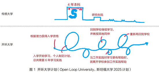 美国教育部前任副部长Ted Mitchell在主旨报告中指出,美国有三百万个新工作,同时60%的雇主表示很难找到合适的人(BusinessRoundtable,2010),因此获得学位并不是学习的终点,未来的人在一生中都需要学习的计划,斯坦福大学的开环大学计划(Open Loop University,stanford2025)就是希望构建这样全新的终身学习生态环境,Coursera所践行的在线教育就是实现终身教育的重要基础,如图1所示。