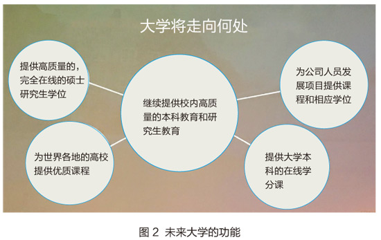 在这样的背景下,大学又应该走向何处?Coursera的首席执行官Rick Levin提到,未来的大学将不仅仅提供高质量的本科生和研究生校内教学,还需要提供在线的学分课程、高质量的在线研究生项目,也要考虑为其他高校提供课程,更重要的是要和政府企业合作提供人力发展计划,如图2所示。