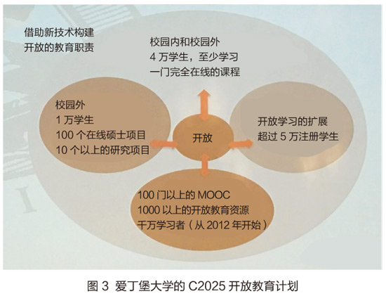 在专题讨论中,Coursera创新伙伴计划成员之一爱丁堡大学介绍了学校C2025开放教育计划(如图3所示),和RickLevin对于未来大学的畅想相呼应。除此之外,伊利诺伊大学(University of Illinoisat Urbana-Champaign)的3个在线硕士项目的成功实践以及俄罗斯高等经济研究大学已将其他高校MOOC(由学校指定)纳入本校选课体系,这些实践均在表明上述未来大学的新型功能已初见端倪。