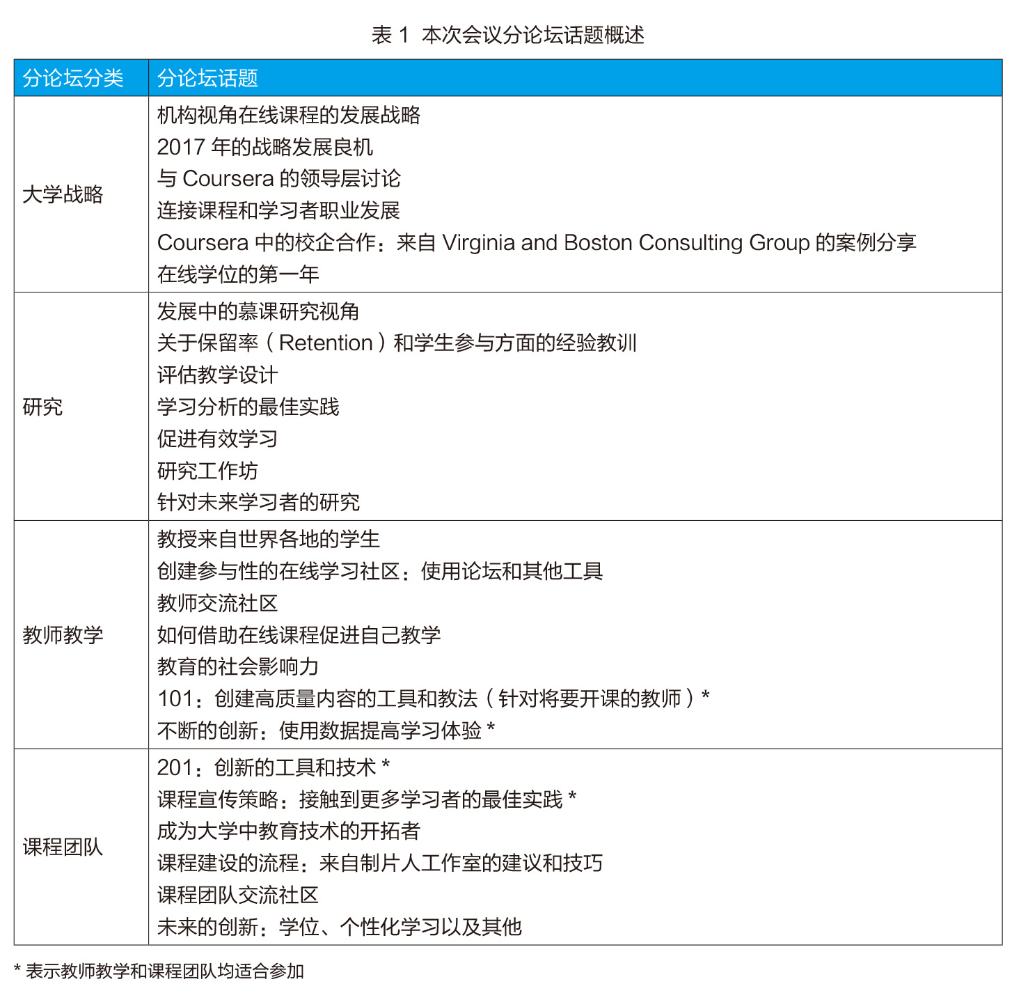 本届年会还首次开设“课程团队”分论坛,主要针对教学设计师(Instructional Designer)、课程制片人、项目经理、学习设计专家等帮助教师建设慕课的人员,引导大家共同探索创新教法、高质量学习体验的构建工具、课程开发创新工具等。本次会议分论坛话题概述如表1。