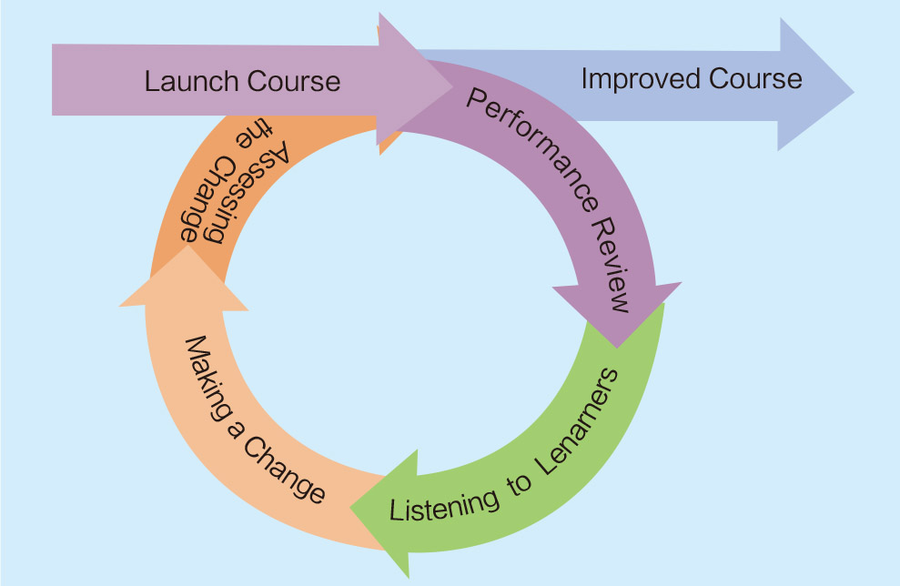 此外,还采用文本分析的方法去理解学习者的观点,发现在这类课程中,大量学习者反馈要求增加练习反馈,并认为练习题让人迷惑。于是针对这类课程进行了调整:一是在练习题干后清晰地说明正确答案的数量;二是针对错误的选项增加了详细的反馈。改进后的课程显著地降低了练习尝试次数,首次尝试的平均分也大幅增加。最后,他们也提出课程开放后教师需要通过数据面板关注学习者的行为,倾听学生的反馈,据此做出相应的调整和改进,最终评估改变的效果,这就是改进课程的方式,如图1。