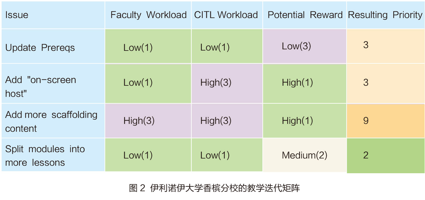 伊利诺伊大学香槟分校教学创新中心(Educational Innovation)副主任Jason Mock介绍了该校在线硕士项目课程是如何在迭代中改进创新的做法,参与课程迭代改进的有教学设计师、媒体专家以及数据分析组,依据数据做决策,授课教师、教学设计师以及研究人员定期一起讨论,并设计了课程迭代矩阵,综合教师的投入、教学发展人员的投入以及可能带来的效应,来决定咨询讨论时的优先事项,如图2。此外,为了帮助教师快速定位课程问题,他们会为教师提供管理月报,将课程数据面板中需要注意的情况反馈给教师。