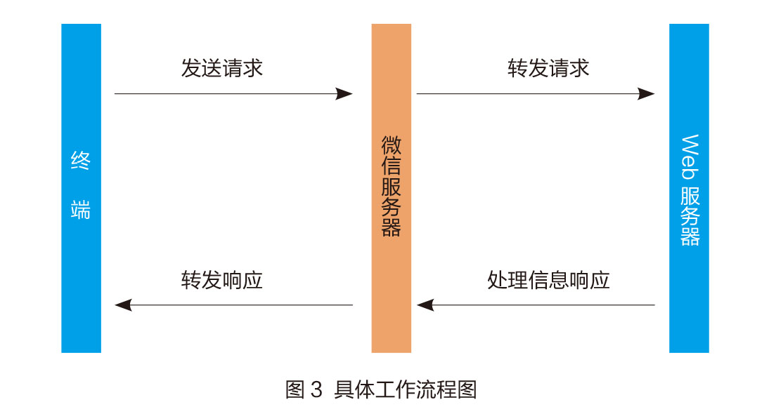 (1)微信公众平台开发接口实现了用户和服务器间的联系。对于关注了微信公众平台的用户,他们在微信公众号内发出一次请求,微信服务器会使用HTTP请求转给Web服务器,响应后将处理结果回传给微信服务器,此时用户便可在微信公众号内收到回复。这一系列过程就是用户使用客户端完成一次完整的会话。具体工作流程如图3所示。