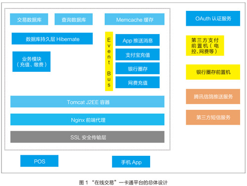 首先,因多数业务是联机交易,业务的计算和存储依赖后端完成,因此对网络要求较高。其次,对于某些特殊场合的交易(如洗浴计费),还要考虑类似账单的设计,降低交易对网络和卡片的依赖。最后,在过渡阶段,要考虑脱网情况下的可交易性,应对突发事件。因此需要设计如图1所示的技术架构,充分满足各类扩展性、高并发性的需求。