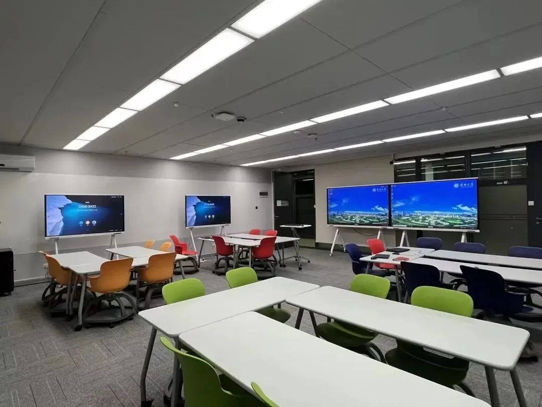 从今年9月份开始,深圳大学分处粤海、丽湖两个校区的4.5万师生不用再乘坐校区通勤车,花上30多分钟往返上课了。学校106间智慧教室被大规模应用到教学实践中,“跨校区互联互通”、“分组讨论”、“多屏互动”等智慧教室的功能得到师生的普遍认可,据学校教务部门统计,深圳大学本学期已有73门课在智慧教室开设,选课人次接近3000人,66.05%的学生认为在智慧教室上课有助于提升学习效果。