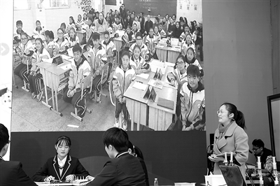 蚌埠二中的吴艳老师(右)在全国第四届智慧课堂观摩研讨会上,运用互联网与成都西藏中学师生同步共生课堂。资料图片