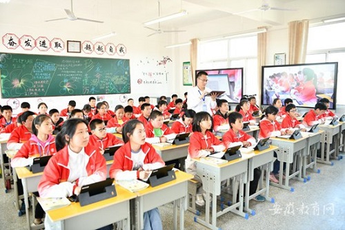 据了解,安徽省在2018年遴选了364所智慧学校示范校和实验校。目前,这些学校都完成了基础版建设:学校网络带宽质均提速至200M,确保在线课堂视频流畅不卡壳;无线网络在教学、办公及主要公共活动场所实现了全覆盖;学生用机配备和多媒体教学设备完成了升级改造,生机比控制在7∶1以内。