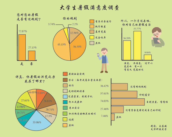 调查结果显示,72.87%的受访大学生对暑假作过规划,45.15%的受访者认为规划“执行较差”,12.56%的受访者表示“基本荒废”。在暑假满意度问题上,36.22%的受访大学生对自己的暑假生活表示“满意”,52.73%的大学生认为满意程度与金钱无关。而对暑假生活“不满意”的主要原因包括“自制力差,有惰性”“计划落空”“没有明确规划”。