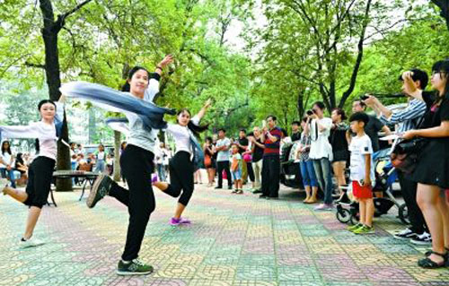 北语中外学生艺术团表演传统舞蹈《粉墨》,吸引新生和家长驻足观看