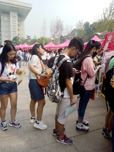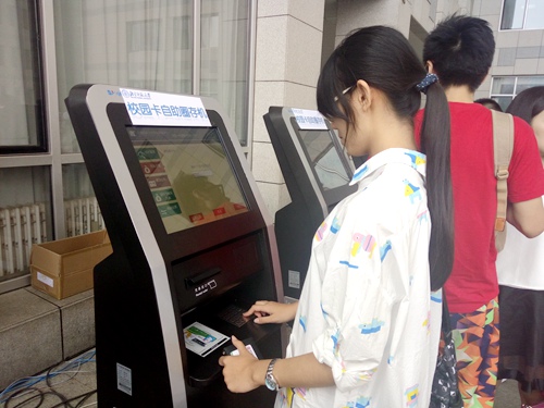 在主楼广场设立的校园卡服务专区,新生正体验全自助校园卡服务