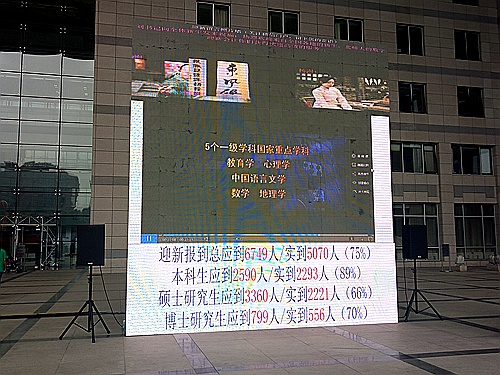 位于主楼前方的大屏幕正播放百年师大形象片,并时刻更新入学新生的报到率
