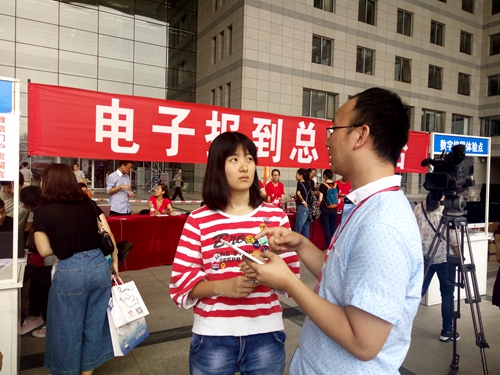 在主楼前的电子报到总咨询台,志愿者用扫描PAD为新生演示二维码扫描的方式报到