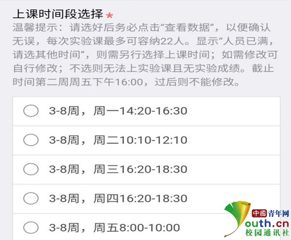 记者了解到,该校教务处不排实验课,而是由任课老师和各班学习委员协商安排实验课时间,并且每个时间段上课人数不得少于20人。但由于每位同学选修科目的不同,课表也不相同,通常学委协调统一时间需花费很大精力,同时也有同学课程安排紧凑,几次三番协调不周造成很多麻烦。