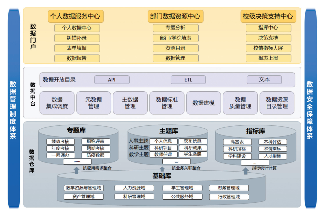 一是基础库。基于校级数据标准构建数据模型,按照人力资源域、学生管理域、教学资源与管理域、科研管理域、财务管理域、资产管理域、公共服务域八个主题域进行分类,构建基础数据仓库。