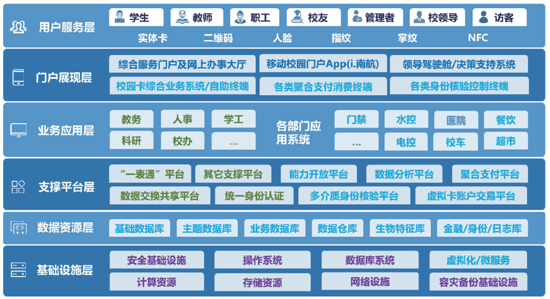 5.门户展现层。提供基于校园卡的Web门户、App门户的后端服务支撑,前端由学校App、企业微信等移动入口完成。