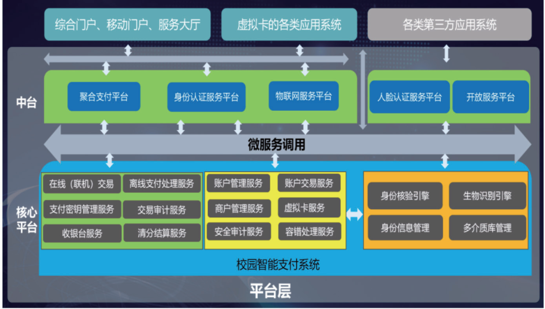 3.支撑平台层。校园卡核心平台,如聚合支付、介质管理、支付平台、虚拟卡平台等,为一卡通提供平台支撑。同时,支撑平台层与学校流程平台、统一身份认证、共享数据平台实现数据的互联互通、流程整合,共同为智慧校园提供基础平台业务。