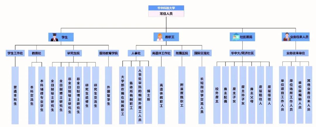 为明确常住人员管理的原则与目标,华中科技大学从实际情况出发拟定《华中科技大学常住人员管理办法》,确定了“谁登记、谁负责,谁管理、谁负责,谁提供、谁负责,谁审核、谁负责”的总体原则,细化了各部门职责和权限,阐述了各类常住人员的管理流程,奠定了高校常住人员管理平台建设的基础。