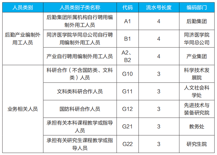 人员编码标准依照是否有权威数据来源分为三类:一是有源人员,即有信息化系统管理的人员(如学生、教职工),这类人员沿用原编码方式;二是半源人员,即二级单位通过线下文档管理并有人事编号需求的人员(如单位自编码人员),针对这类人员,平台结合业务单位自编码人员类型自动生成由4位年份数字、自编码人员类型码、流水号组成的10位编码,表1展示了华中科技大学部分自编码人员类型码编制规则;三是无源人员,即没有通过任何方式进行管理,也没有人事编号需求的人员(如社区居民),这类人员在登记入库时,将被赋予随机生成的16位数字编码。