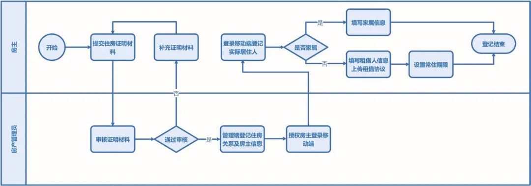 高校社区居民登记与校内住房存在强关联,所以社区居民登记首先需要房产管理员通过管理端进行住房登记,再由房主自行登录平台移动端登记住房内的实际居住人,其具体流程如图3所示。