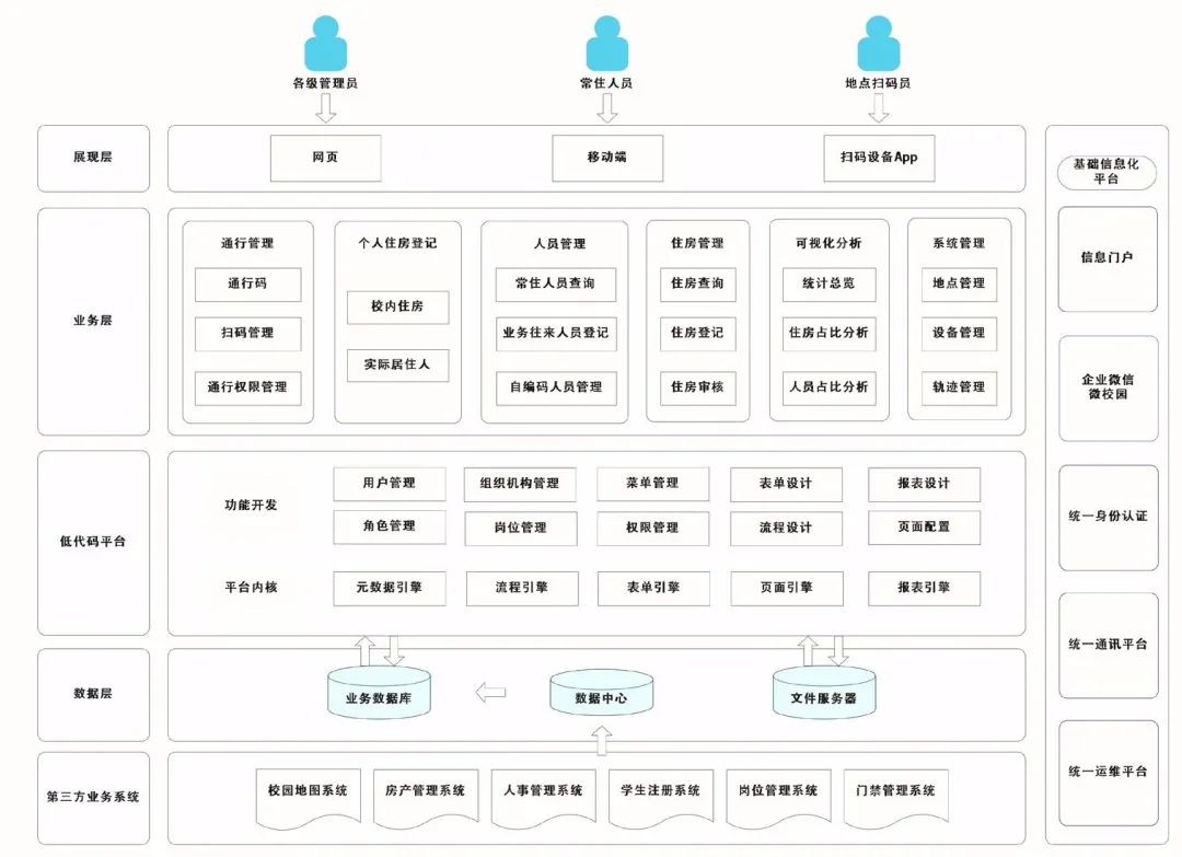 为实现高校常住人员的统筹管理,华中科技大学利用数据共享中心打通第三方业务系统的数据壁垒,借助低代码平台实现常住人员采集和管理流程的信息化,依托高校基础化信息平台,建立了高校常住人员管理平台,平台架构如图2所示。