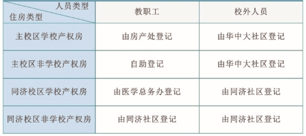 考虑到高校内多校区、多住房产权类型的情况,房产管理员通常不唯一,而是根据房主人员类型不同、住房类型不同进行了职权划分。华中科技大学常住人口住房登记权限见表2。