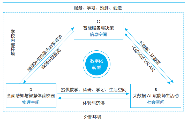 三个智慧空间,打造智能服务与决策的信息空间、智慧感知与体验的校园物理空间、大数据AI赋能师生活动的社会空间;