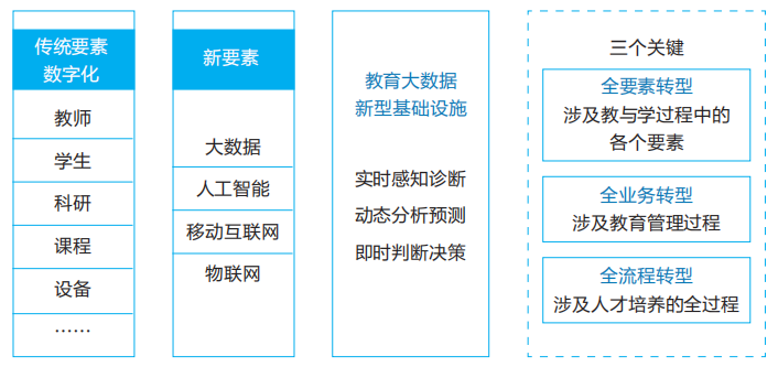 建设教育大数据基础设施是高校数字化转型的关键环节。如图2所示,在教师、学生、科研、课程、设备等传统要素数字化的基础上,叠加大数据、人工智能、移动互联网和物联网等新要素,组成教育大数据新型基础设施,实现实时感知诊断、动态分析预测、即时判断决策。全要素、全业务、全流程的转型是其中的三个关键,数字化转型要涉及教与学过程中的各个要素,涉及教育管理过程,涉及人才培养的全过程。
