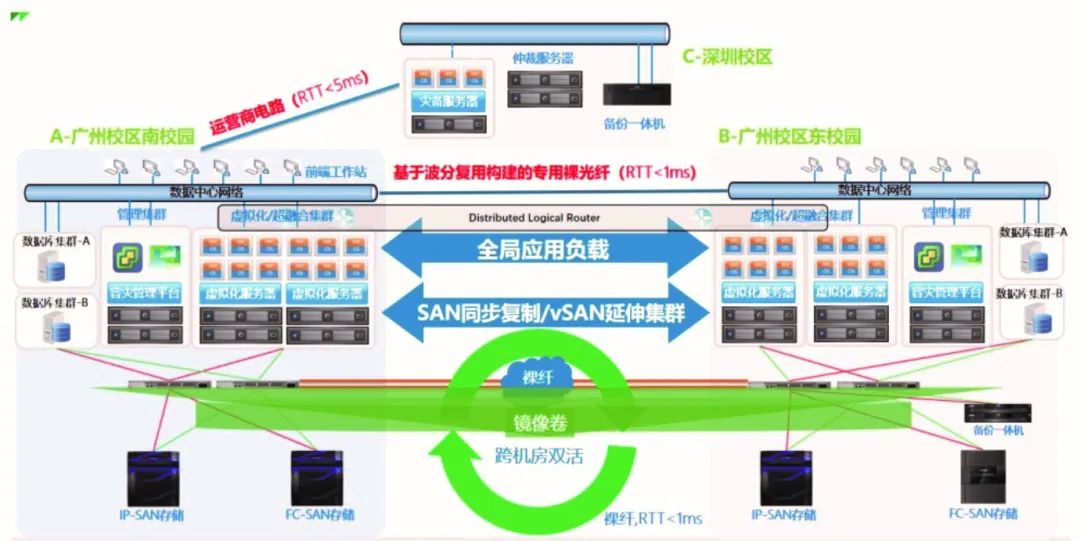 在“十四五”期间,我们将基于学校多校区的情况重点推进“两地三中心”数据中心建设,如图1所示,主要包括以下两个方面: