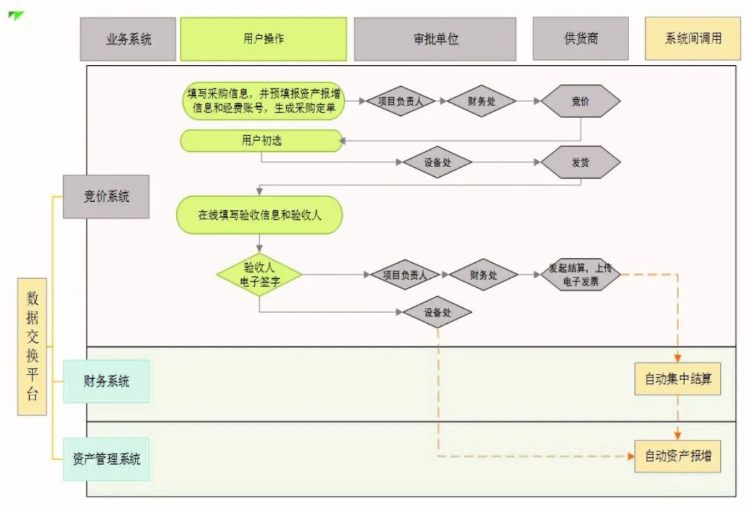 一是接口互通。通过数据交换平台,实现了竞价系统、财务系统和资产系统的接口互通。