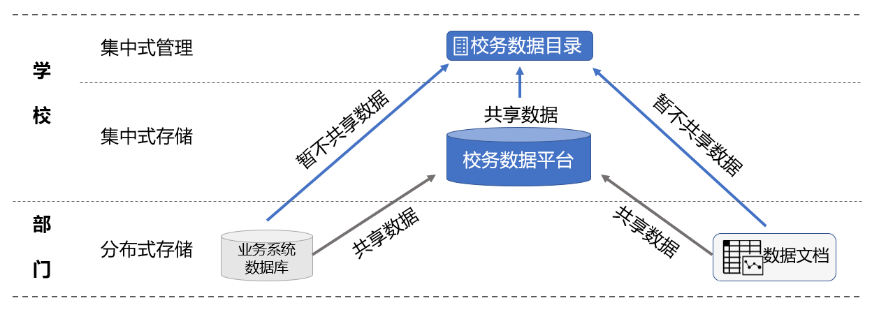如图1所示,通过校务数据资源目录建设与常态化更新机制,通过校务数据资源目录建设与常态化更新机制,将各职能部门系统化、文档型,明细型、统计型等各类校务数据全面纳入目录管理,理清数据源头,掌握数据形态、更新周期,落实生产责任。要求部门按需共享数据,以集中式与分布式相结合的方式存储数据。