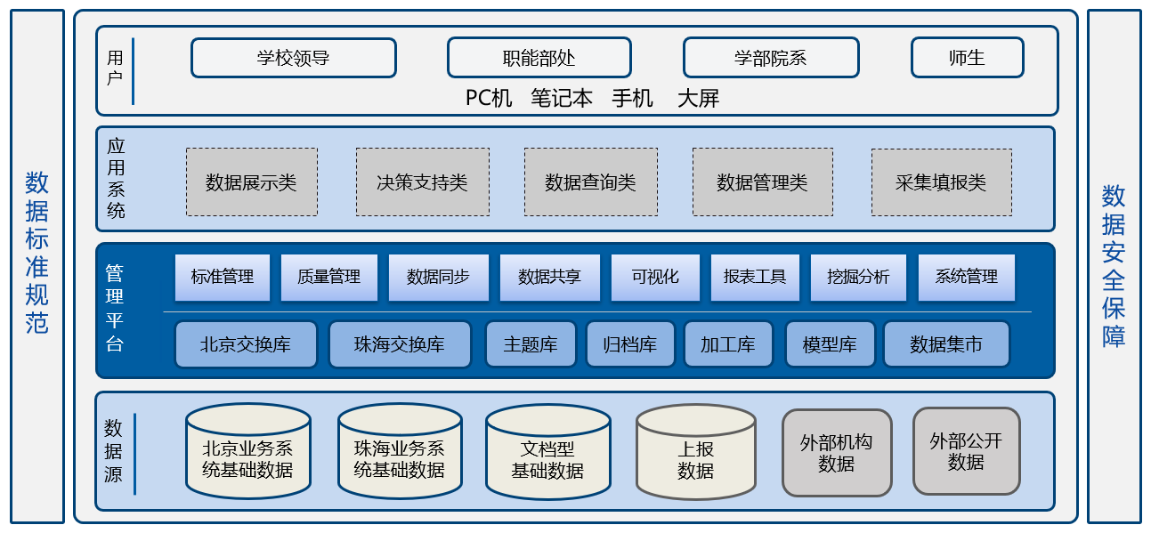 通过汇聚两校区多业务系统数据、部门文档型基础数据、上报数据、外部机构数据、外部公开数据,建立数据仓库,设立交换库、主题库、归档库、加工库、模型库,以数据集市面向上层应用提供服务,打造了坚实的数据基座。